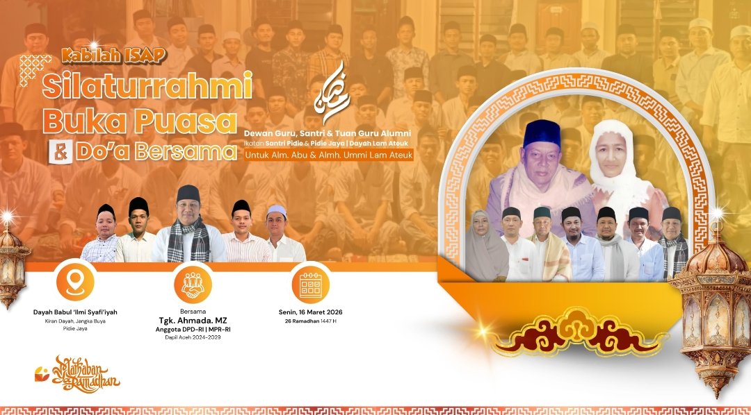 PIDIE JAYA – Ikatan Santri Pidie dan Pidie Jaya (ISAP) akan menggelar kegiatan silaturahmi, buka puasa bersama, dan doa bersama dalam momentum bulan suci Ramadhan di Dayah Babul Ilmi Asyafi’iyah, Kabupaten Pidie Jaya, pada Senin, 16 Maret 2026.