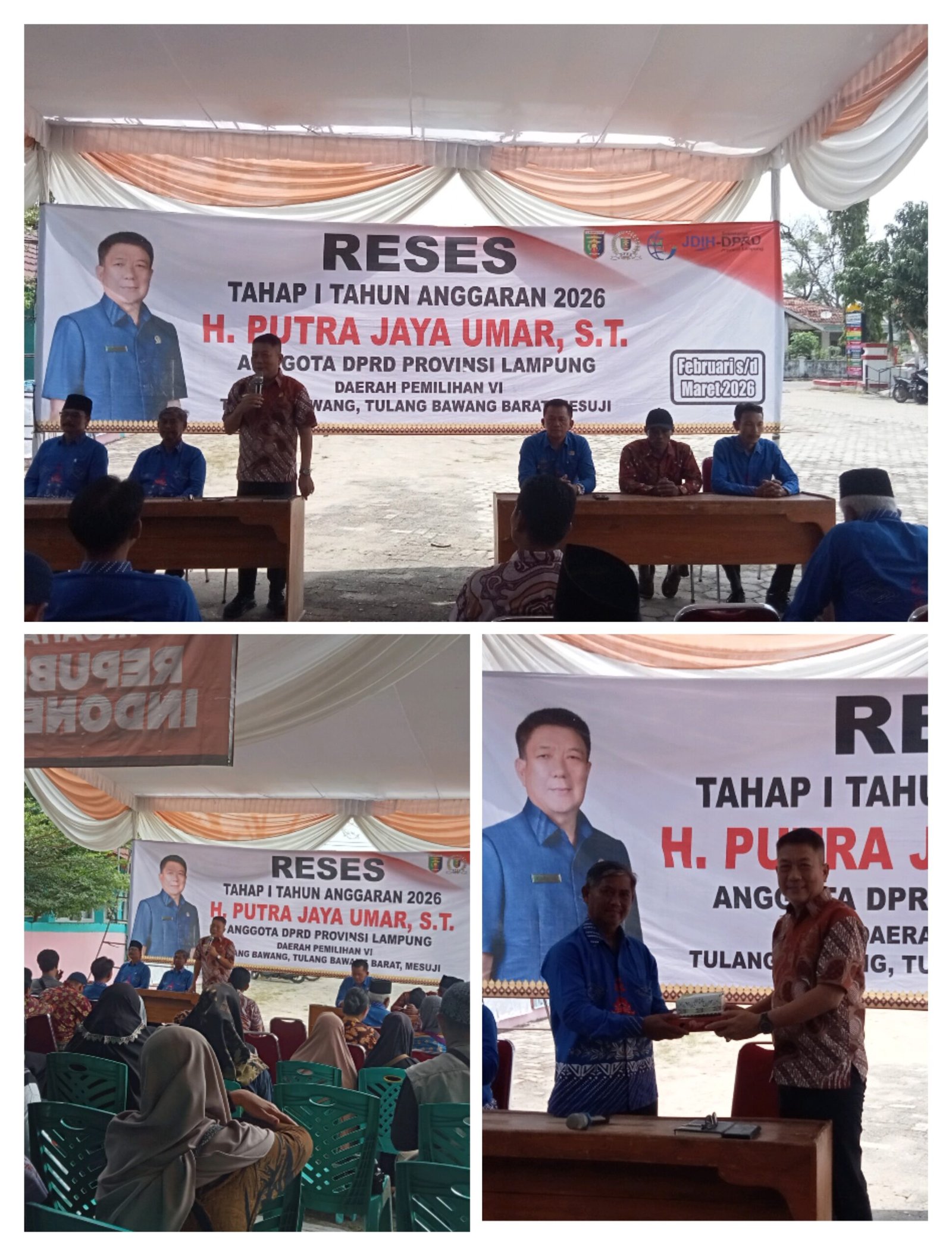 DAILY MAIL INDONESIA.COM—Anggota DPRD Provinsi Lampung H.Putra Jaya Umar, S.T dari dapil enam , meliputi tiga kabupaten, TUBABA,Tuba dan Mesuji laksanakan Reses tahap satu ( 1 ) tahun 2026 yang merupakan rangkaian reses terakhir yaitu yang ke 12 di kabupaten Tulang Bawang Barat, Bertempat di Tiyuh Pulang Kencana, Kecamatan Tulang Bawang Tengah, Kamis ( 5-03-2026 )