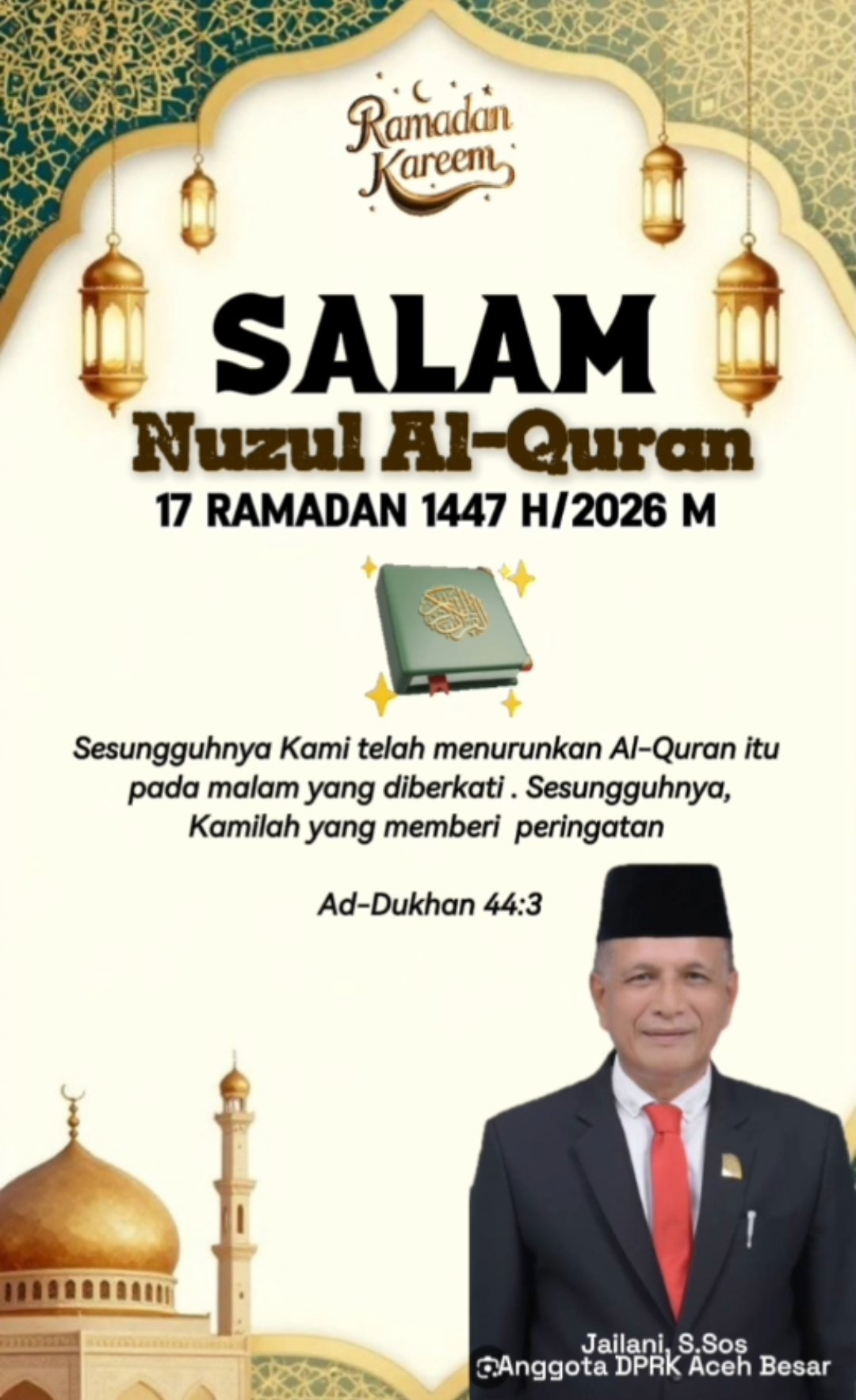 ACEH BESAR – Anggota Dewan Perwakilan Rakyat Kabupaten (DPRK) Aceh Besar, Jailani, S.Sos menyampaikan ucapan selamat memperingati Nuzulul Qur’an kepada seluruh umat Islam, khususnya masyarakat Kabupaten Aceh Besar. Peringatan Nuzulul Qur’an yang jatuh pada 17 Ramadan 1447 Hijriah atau tahun 2026 Masehi menjadi momentum penting bagi umat Muslim untuk kembali merenungkan makna turunnya kitab suci Al-Qur’an sebagai pedoman hidup.
