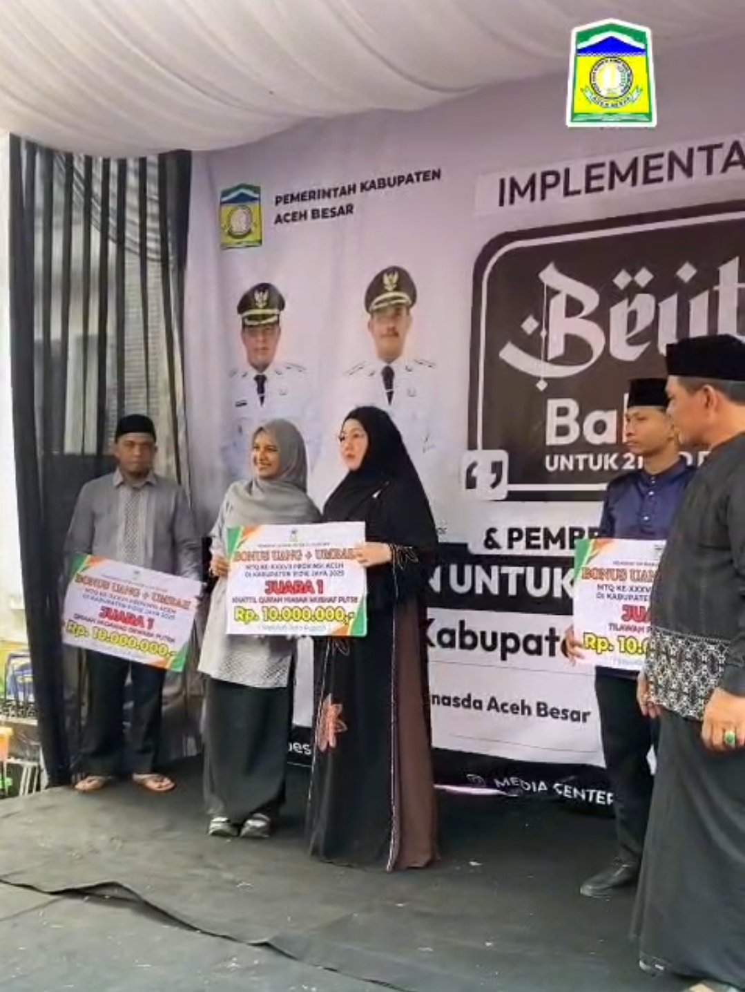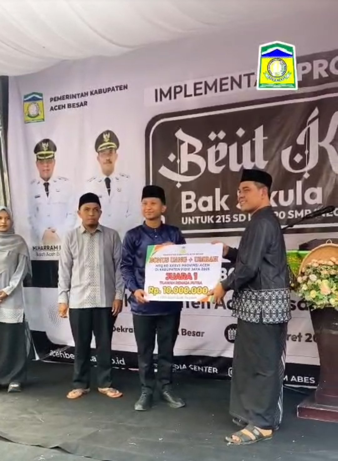 ACEH BESAR — Bupati Muharram Idris menyerahkan bonus kepada para peraih juara Musabaqah Tilawatil Qur’an (MTQ) ke-37 Tahun 2025 tingkat Kabupaten Aceh Besar dalam sebuah kegiatan yang berlangsung penuh khidmat di kantor Dekranasda Aceh Besar, Selasa (10/3/2026). Dalam kesempatan yang sama, pemerintah daerah juga menyalurkan santunan kepada 4.800 anak yatim serta meluncurkan implementasi program “Beut Kitab Bak Sikula” di seluruh sekolah tingkat SD dan SMP di Aceh Besar.