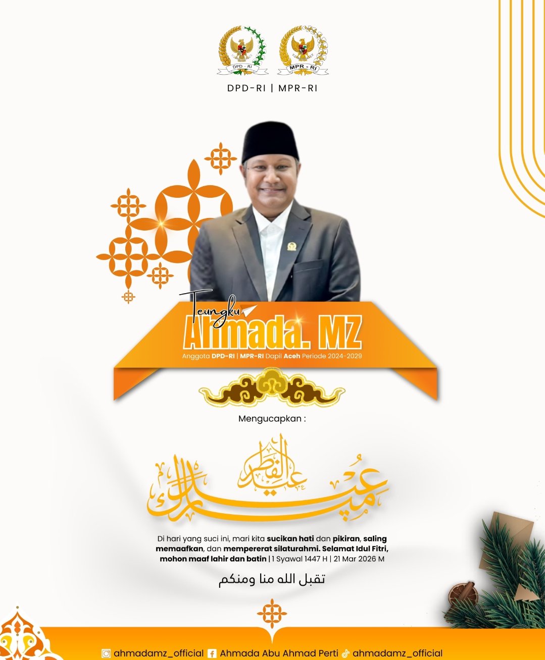 ACEH – Momentum Hari Raya Idulfitri 1447 Hijriah dimanfaatkan oleh anggota DPD RI/MPR RI daerah pemilihan Aceh, Tgk Ahmada MZ, untuk menyampaikan pesan penuh makna kepada masyarakat. Melalui ucapan resmi yang beredar, Tgk Ahmada mengajak seluruh elemen masyarakat untuk menjadikan Idulfitri sebagai titik balik dalam memperbaiki diri serta mempererat hubungan antarsesama.