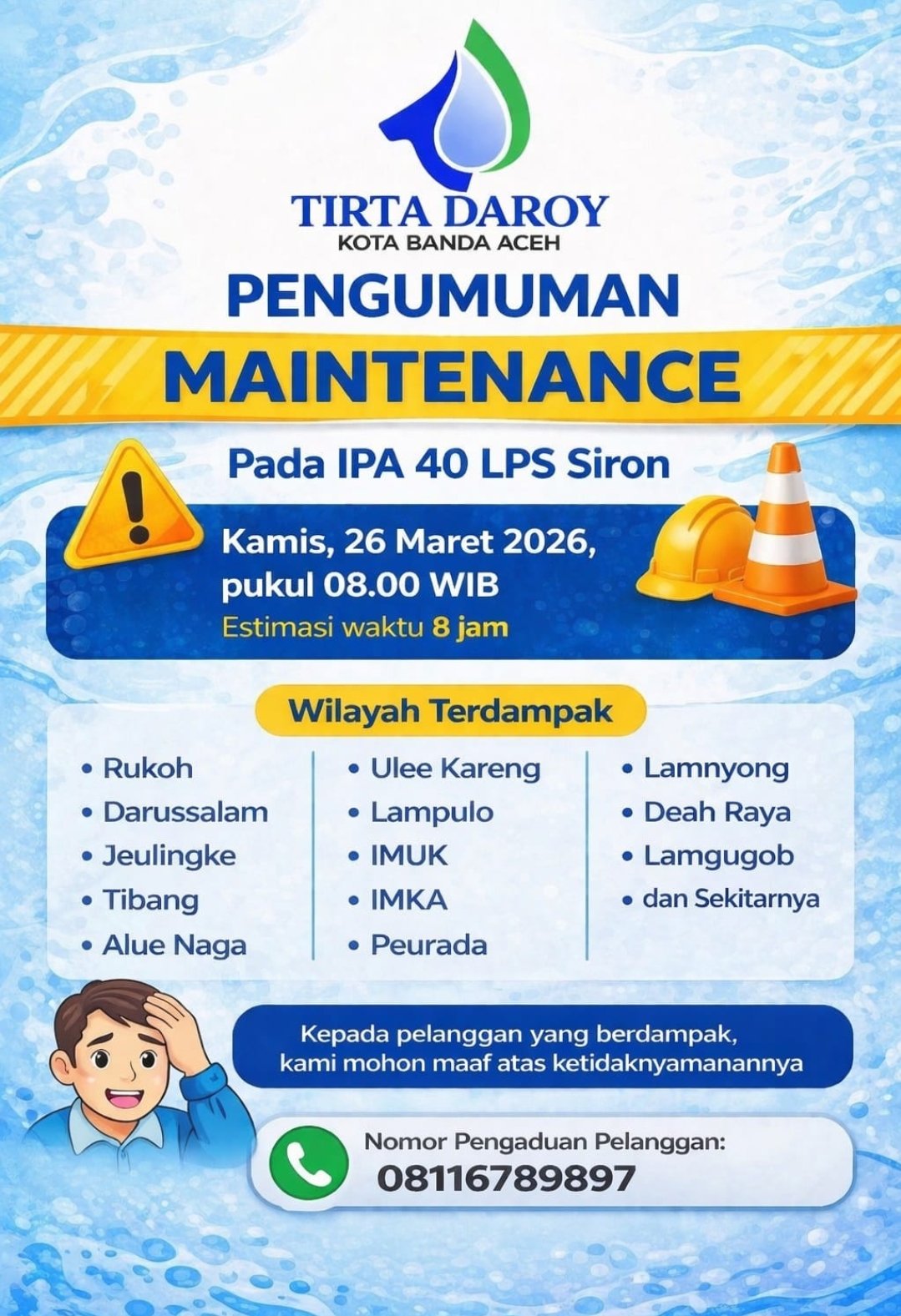 Banda Aceh – Perusahaan Umum Daerah Air Minum Tirta Daroy mengumumkan akan melakukan kegiatan pemeliharaan (maintenance) pada Instalasi Pengolahan Air (IPA) berkapasitas 40 liter per detik di kawasan Siron. Kegiatan ini dijadwalkan berlangsung pada Kamis, 26 Maret 2026, mulai pukul 08.00 WIB dengan estimasi waktu pengerjaan selama kurang lebih delapan jam.