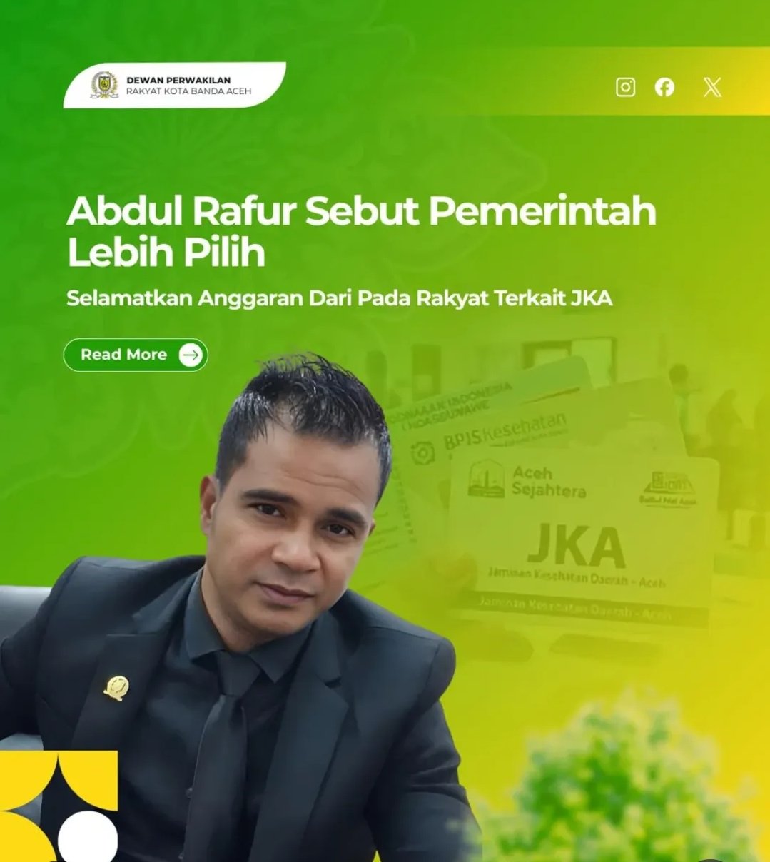 Abdul Rafur, menegaskan bahwa program JKA bukan sekadar angka dalam dokumen anggaran, melainkan bentuk nyata kehadiran pemerintah dalam menjamin hak kesehatan masyarakat. Menurutnya, pengurangan cakupan JKA dapat membuka potensi terputusnya akses layanan kesehatan bagi ratusan ribu warga Aceh.