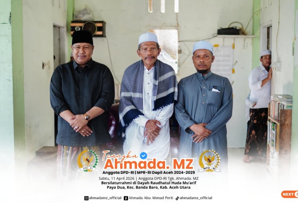 Aceh Utara – Suasana hangat penuh kekeluargaan menyelimuti pertemuan antara Anggota DPD RI/MPR RI Dapil Aceh, Tgk. Ahmada MZ, dengan para ulama dan masyarakat di Dayah Raudhatul Huda Mu’arif, Gampong Paya Dua, Kecamatan Banda Baro, Kabupaten Aceh Utara, Sabtu (11/4/2026).