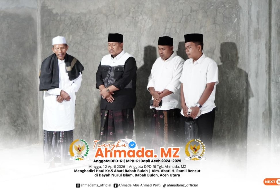 Aceh Utara – Suasana khidmat dan penuh kekhusyukan menyelimuti pelaksanaan haul ke-5 almarhum Abati H. Ramli Bencut yang digelar di Dayah Nurul Islam, Babah Buloh, Kabupaten Aceh Utara, Minggu (12/4/2026). Kegiatan ini turut dihadiri oleh Anggota DPD RI/MPR RI dapil Aceh, Tgk. Ahmada MZ, bersama para tokoh agama, santri, serta masyarakat setempat.