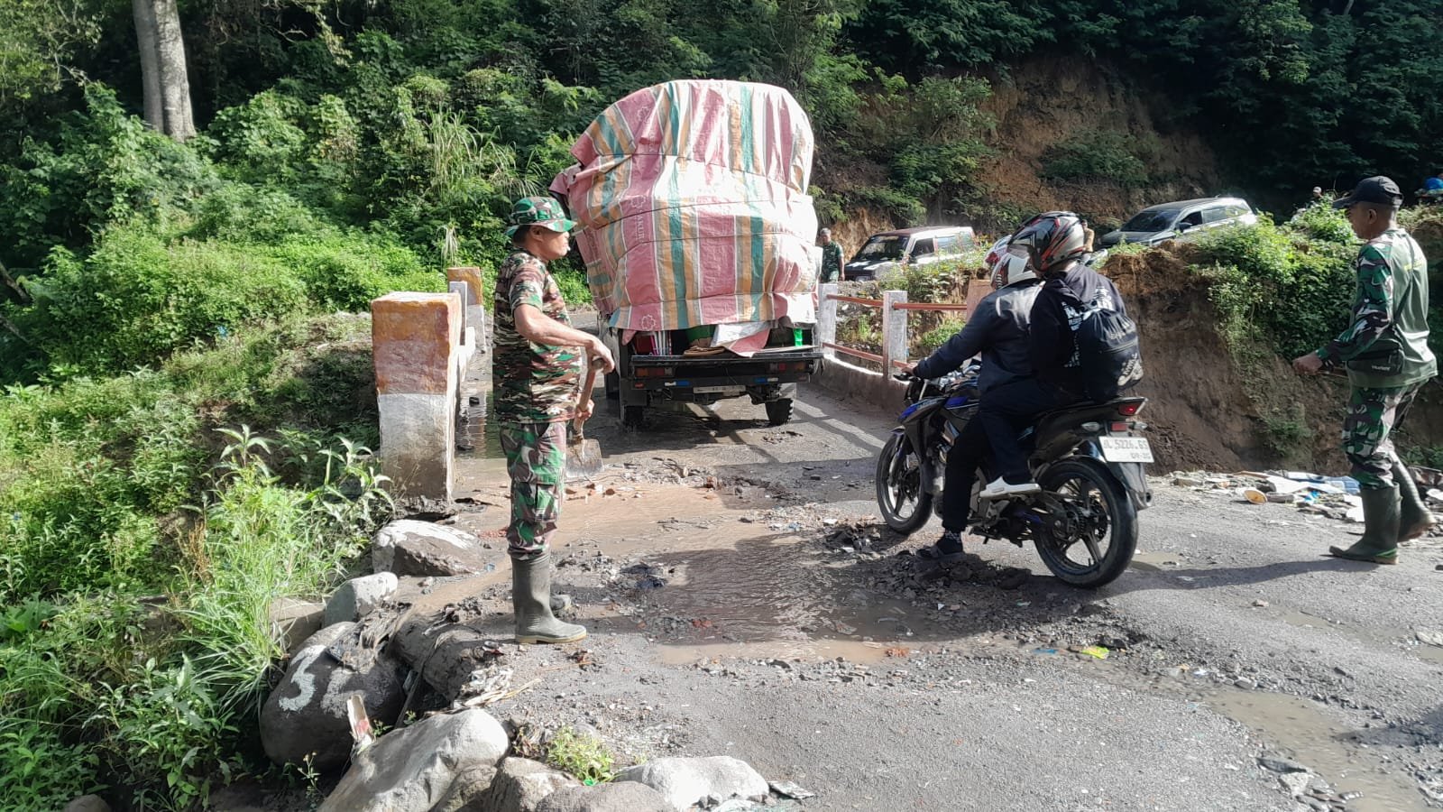 Dengan penuh semangat kebersamaan, para personel Koramil 01/Bandar bersama warga setempat bergotong royong membersihkan material tanah yang menutupi sebagian badan jalan. Berbekal peralatan sederhana seperti cangkul dan sekop, mereka bekerja secara bahu-membahu demi menciptakan kondisi jalan yang lebih aman, bersih, dan nyaman digunakan.
