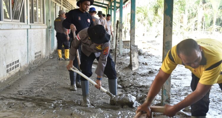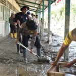 Bireuen – Puluhan personel Polres Bireuen dikerahkan untuk membersihkan sampah dan lumpur
