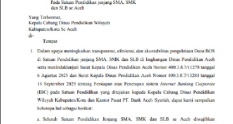 Disdik Aceh Wajibkan Sekolah Menggunakan Internet Banking Corporate untuk Dana BOS Mulai 2026