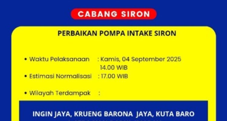 Aceh Besar – PDAM Tirta Mountala mengumumkan adanya gangguan layanan air bersih