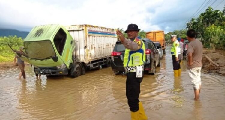 Personel Satlantas Polres Aceh Selatan Gatur Jalan di Lokasi Banjir