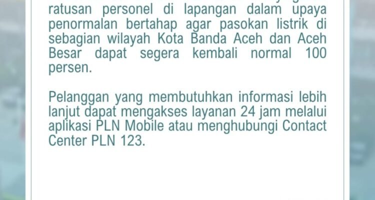 PLN Siagakan Ratusan Personel untuk Pulihkan Listrik Banda Aceh dan Aceh Besar