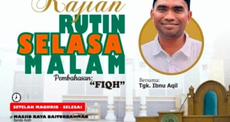 Kajian Rutin Selasa Malam di Masjid Raya Baiturrahman Bahas Fiqih Bersama Tgk. Ibnu Aqil Islam|07/01/2026oleh mul yadi BANDA ACEH – Masjid Raya Baiturrahman Banda Aceh kembali menjadi pusat kegiatan